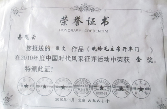 征文頒獎活動在北京人民大會堂舉行。為了參觀毛主席紀(jì)念堂,岳觀云和妻子提前出發(fā),于2010年9月17日早上到北京,住進(jìn)“中共中央警衛(wèi)團(tuán)”招待所。18日,岳觀云夫婦冒著大雨和上萬人一起排隊,參觀了毛主席紀(jì)念堂,當(dāng)他看見曾經(jīng)保衛(wèi)過的偉大領(lǐng)袖毛主席的遺容時,回想昔日種種,眼淚止不住地往外流!