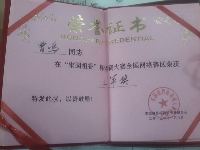 七律·品茗隨感 作者 四川瀘州曾鳴 茶吟三昧幾真詳?了了沉浮率性張。 陸羽十章禪寫意,宋園一脈祖留香。 風行曠野空空盡,緣起周天寂寂常。 壺滿千江觀自在,澄心入味品滄桑。 注:陸羽《茶經》,三卷十章七千余字。 本詩在宋園祖香杯全國詩詞大賽中被評為第四名。