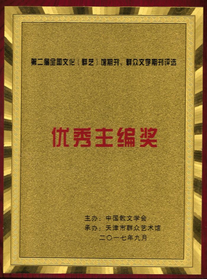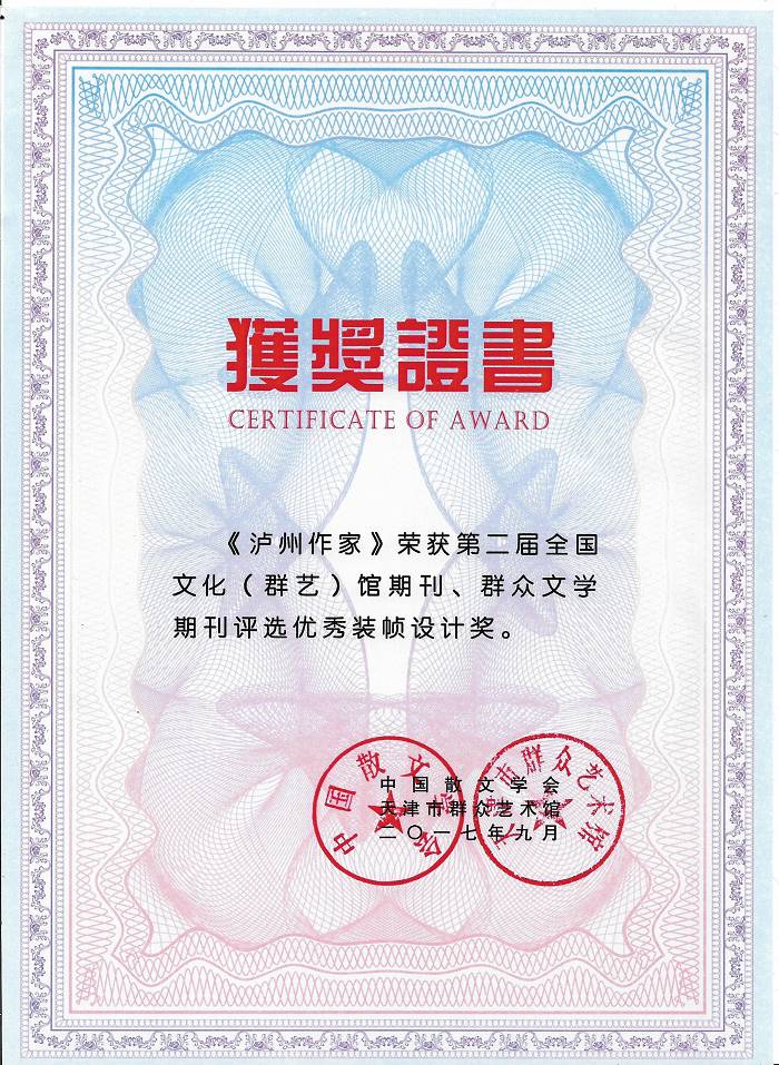此次評選由中國散文學會主辦、天津市群眾藝術館承辦,設“優秀主編、優秀期刊、優秀編輯、優秀欄目、優秀裝幀設計獎”五個獎項,得到全國各省市眾多文學藝術期刊積極響應,文學雙月刊《瀘州作家》以其鮮明的辦刊風格、先進的文學理念、藝術的編排設計等特點脫穎而出。