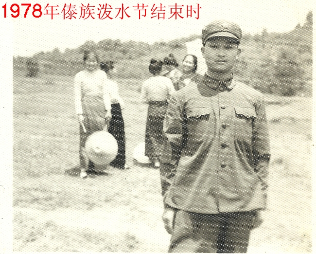 我在磨憨期間,可能是全連中工作時間最長的一個人,從早上起床到天黑,除了三餐和午休之外的時間,基本上都在養豬場忙。豬多,事就多,沒辦法。我在磨憨的13個月中,橫跨兩年傣族潑水節,但第一年4月中旬的潑水節想去看熱鬧未果,而第二年4月中旬的潑水節是在最后一天的下午,才擠出時間同部分戰友乘車去尚勇,遺憾的是只看到傣族盛大節日的一點尾子。人山人海的尚勇街上和街口,已無潑水這一核心內容的熱鬧場面,人們三五成群地出現散離狀。見同去的戰友選擇了一群傣族姑娘為背景照相,我也抓緊機會照了一張作為留念,使情緒低落的我有了些許安慰。