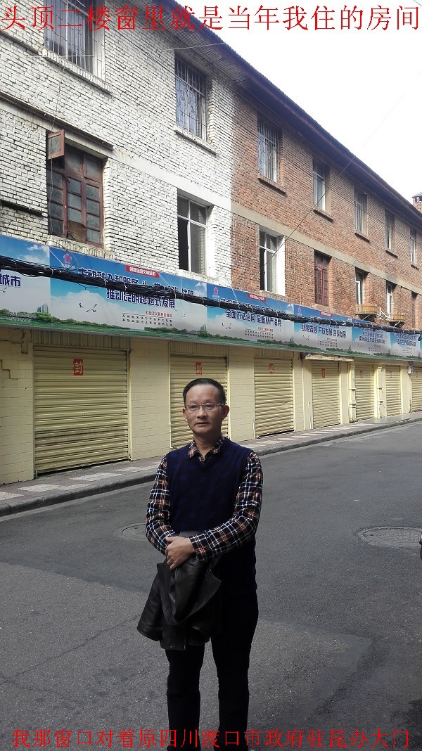 在原來渡口市辦事處的大門旁,我指著南面的樓房對楊平說:這第二層從東往西數(shù)的第二個窗子,就是我原來住的房間的后窗。2006年,我來過一次昆明,曾專程來此尋舊,回四川后卻懊悔沒在這窗下照一張像片作為紀念,因為這種已處于市中心地帶的三層樓的老樓房,說不定哪天說拆就拆了。這次,我不會再漏掉照相的機會,叫楊平趕緊給我拍照,并要求在我頭上正好是那個窗口。