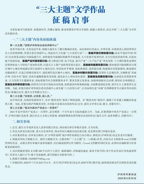 7、征稿時間:2020年7月至2021年6月。雙月刊《瀘州作家》雜志從2020年第4期開始,陸續(xù)增設(shè)相關(guān)欄目擇優(yōu)發(fā)表征稿作品。