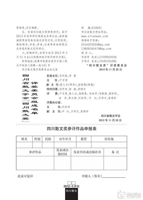 4、參評作品采取推薦和自報相結合的方法。作者系四川省散文學會會員的,原則上由全省各地散文學會組織初選后統一申報。