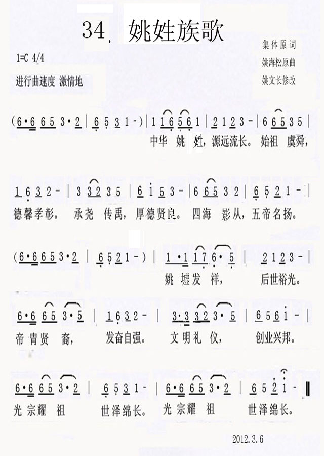 姚姓族歌(集體原詞 姚海松原曲 姚文長修改)